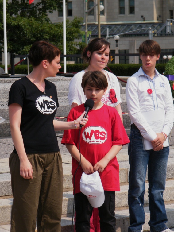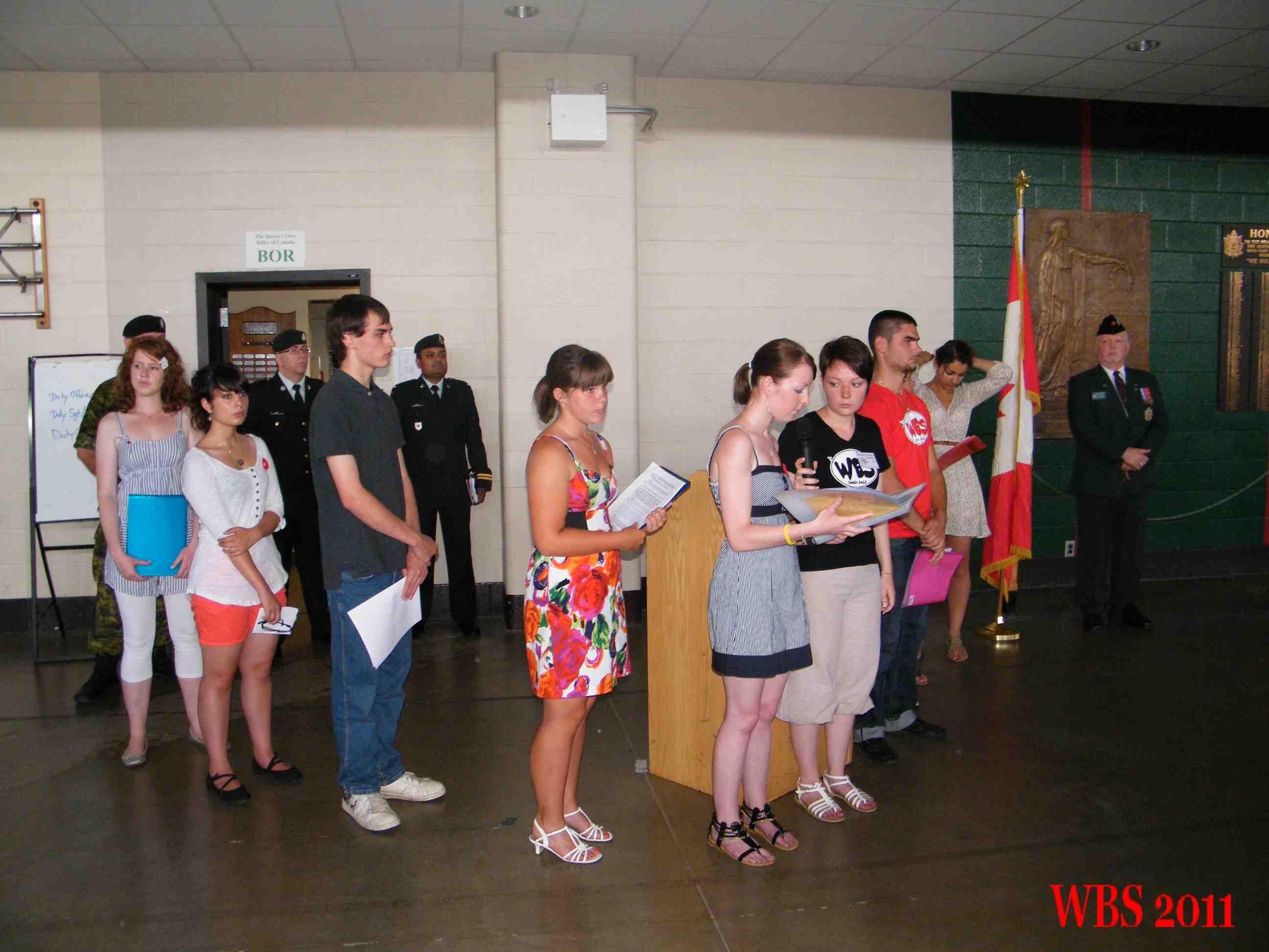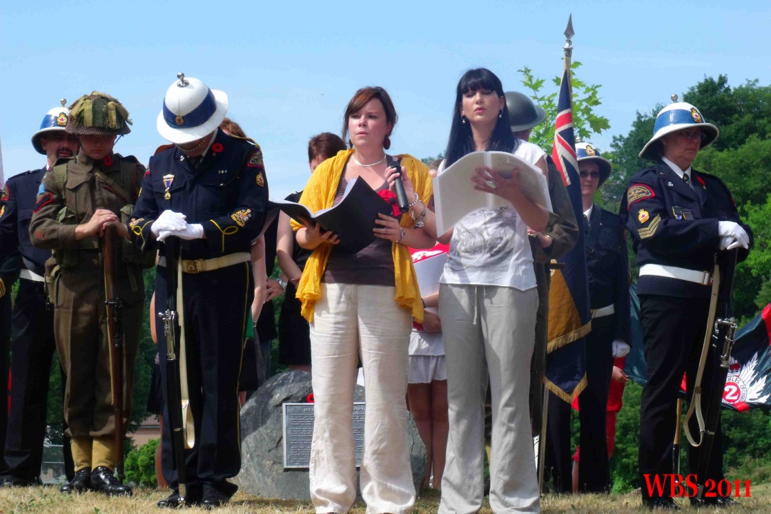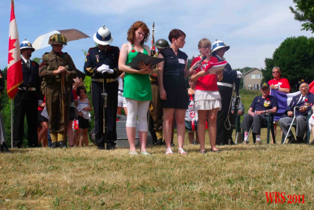 Le protocole militaire vient rehausser notre commémoration : un peloton armé de 19 militaires, tunique rouge et coiffe de poils, se place à deux mètres du pupitre, face à nos jeunes. Le son de la fanfare qui le précède retentit. Le Bouc régimentaire, mascotte du régiment l’accompagne… L’Honorable Steven Blaney, ministre des Anciens Combattants du Canada, nous fait l’honneur d’être présent. Il prononcera un discours d’hommage à nos jeunes. Madame Le Gal, Consule Générale de France est là aussi. Le major Maureen Wellwood, commandante adjointe de la Citadelle, nous offre un joli cadeau et prononce des paroles qui nous touchent au plus haut point.