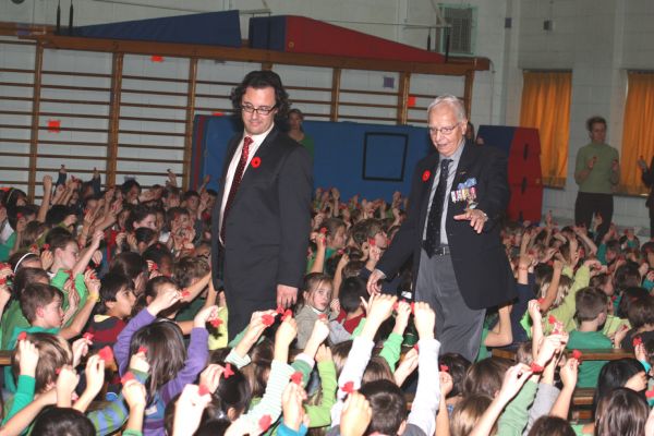 Sébastien Vincent (fondateur du site Le Québec et les guerres mondiales) et le vétéran Gilbert Boulanger lors d’une commémoration du Jour du Souvenir tenue le 9 novembre 2010, à l’école Victor-Thérien.