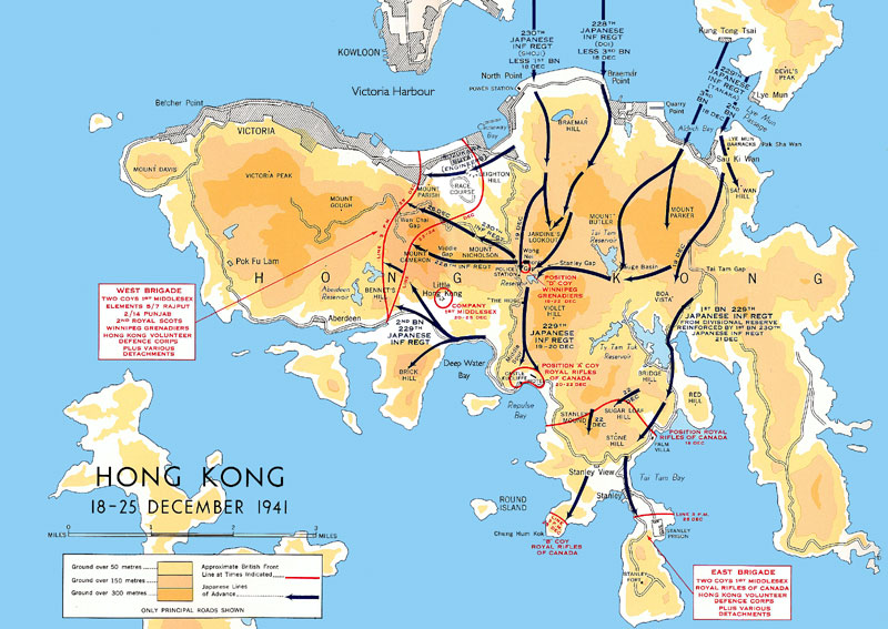 Au moment où une autre compagnie avançait sous le feu de l’ennemi, une voiture portant pavillon blanc arriva et annonça que le gouverneur avait cédé la colonie. Le major général Maltby l’avait prévenu, un peu passé 15 heures, qu’il était inutile de poursuivre la lutte. On hissa le drapeau blanc et après 17 jours et demi de combat, la bataille de Hong Kong se termina.